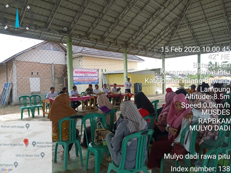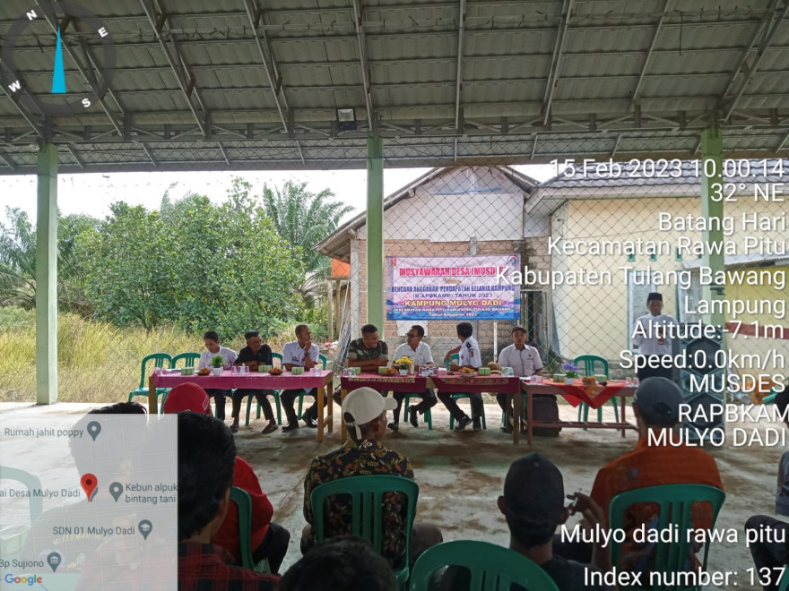 Mulyo Dadi (15/02/2023) Rabu, 15 Februari 2023 bertempat di GSG Kampung Mulyo Dadi, Badan Permusyawaratan Kampung ( BPK ) Mulyo Dadi melaksanakan musyawarah Kampung tentang Rancangan Anggaran Pendapatan dan Belanja Kampung (R-APBKam) Tahun Anggaran 2023. Hadir dalam musyawarah tersebut yaitu Kepala Kampung beserta perangkatnya, Pendamping Desa, Camat dan sekcam, Babinsa, Kelembagaan Kampung, Tokoh Masyarakat serta Tokoh Pemuda.