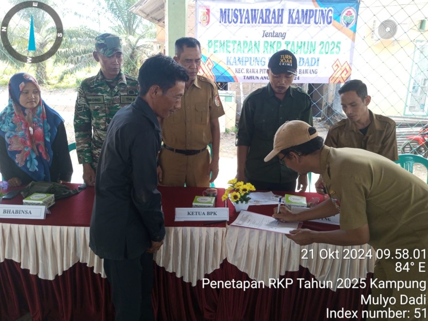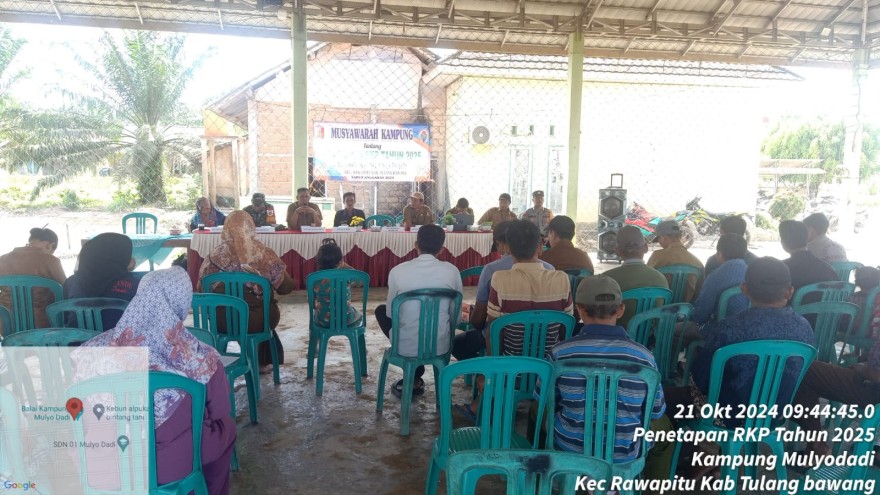 Bertempat di Gedung Serba Guna Mulyo dadi pada hari Senin tanggal 21 September 2024 dilaksanakan MUSDES Penetapan RKP Desa tahun 2025 Peserta yang hadir dalam kegiatan ini : BPK serta Anggota,Kepala Desa Perangkat Desa Kasi Pemerintahan, Babinsa, Bhabinkamtibmas, Pendamping Desa, dan Tim Penyusun RKP.
