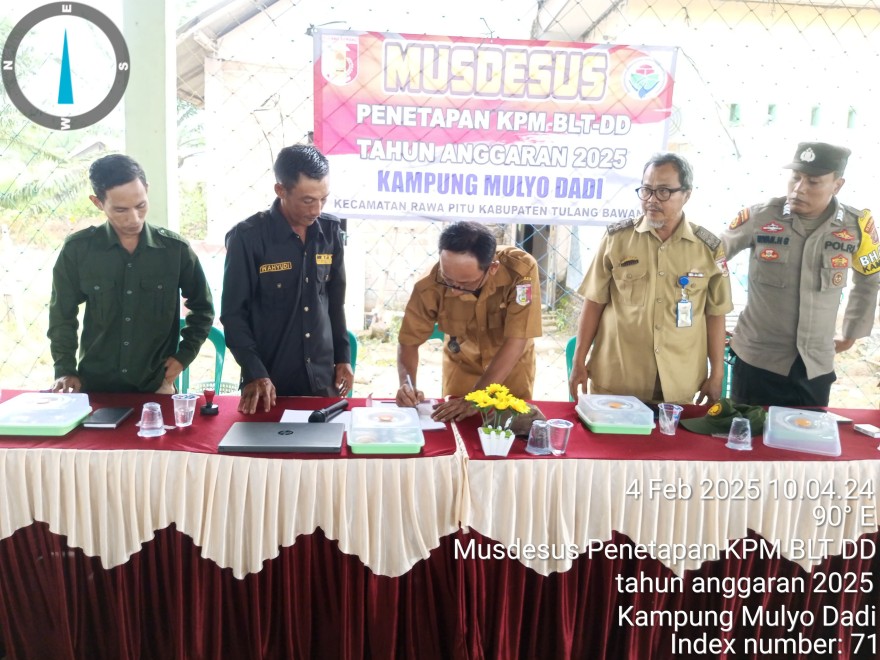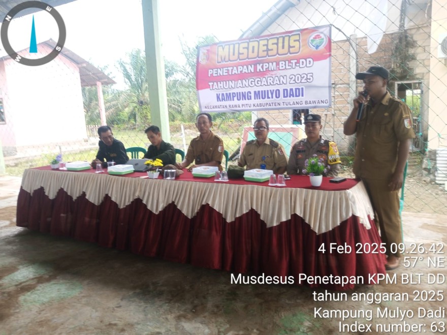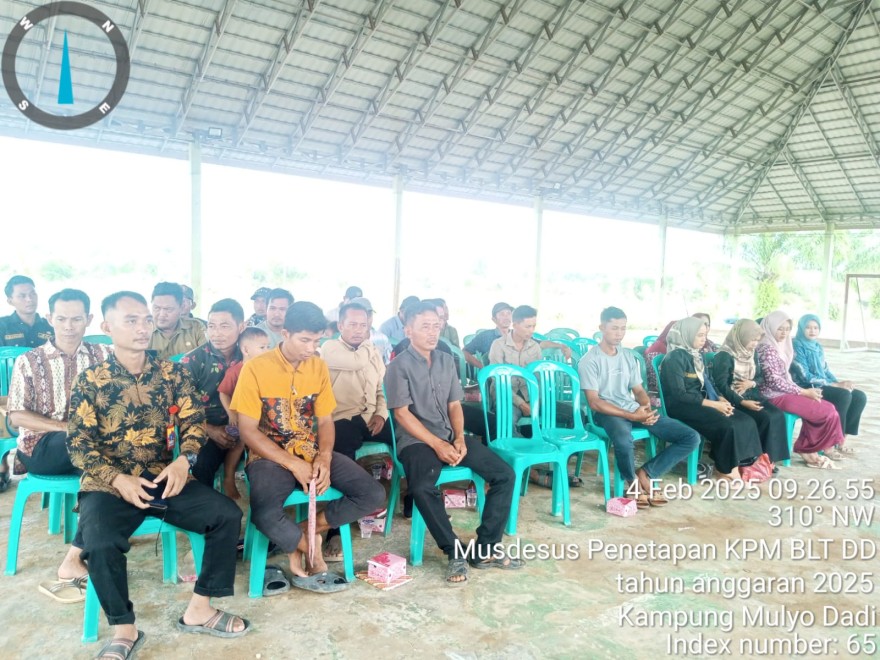 Pada hari Selasa 04 Februari 2025 Desa Mulyo Dadi mengadakan kegiatan Musdesus BLT Desa TA 2025. kegiatan tersebut dihadiri oleh, BPK beserta anggota, Kepala desa dan perangkat desa Mulyo dadi serta ketua RT dan ketua RW. Acara diawali denagn menyanyikan lagu Indonesia Raya. Dalam sambutannya Kepala Desa Molyo Dadi Bapak Yohanes rudiarto.Amd.Kep menyampaikan bahwa BLT Desa masih menajdi skala prioritas penggunaan dana desa tahun anggaran 2025. penerimaan DD 2025. BLT desa diharapkan menjadi salah satu bantuan yang memberi manfaat langsung kepada warga miskin di Desa Mulyo Dadi.